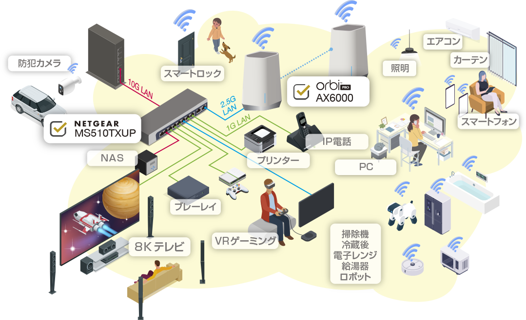 100インチのテレビで高画質4K映画や高速ゲーミングを楽しむ。スマート家電を取り入れた先進的な暮らしを楽しむ。スマホとPCの高性能化や、テレワーク、オンライン授業の普及に合わせ、家族全員が同時に高速WiFi接続ができるホームネットワークが今求められています。今の新しい生活スタイルを快適に過ごし、増え始めているスマート家電も安定的に接続し続けるには、パワフルな10G/マルチギガホームネットワークが必要です。