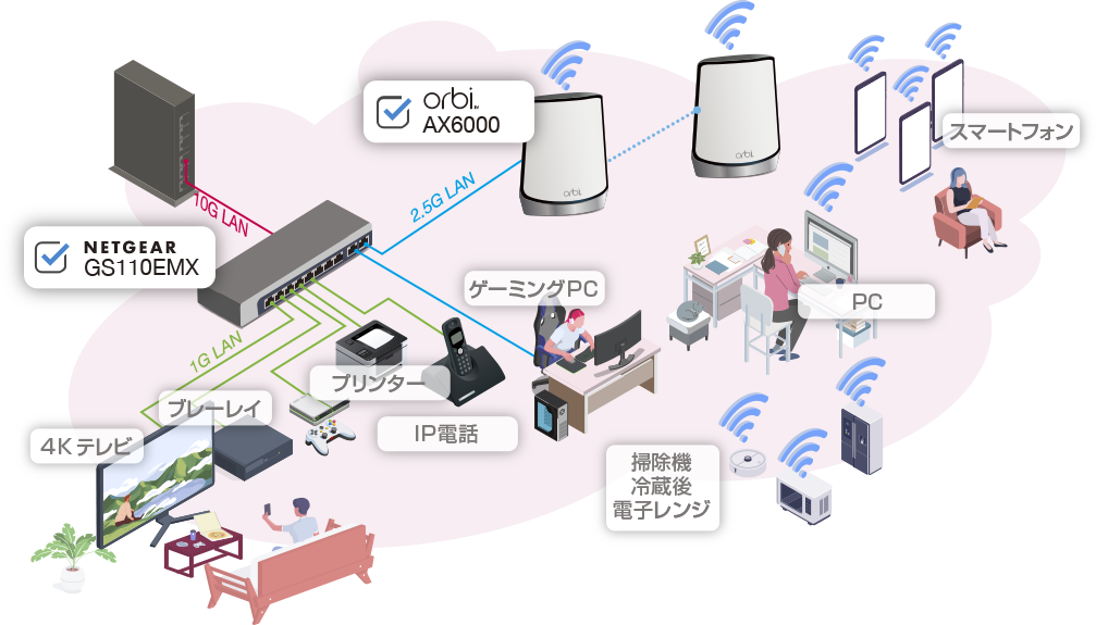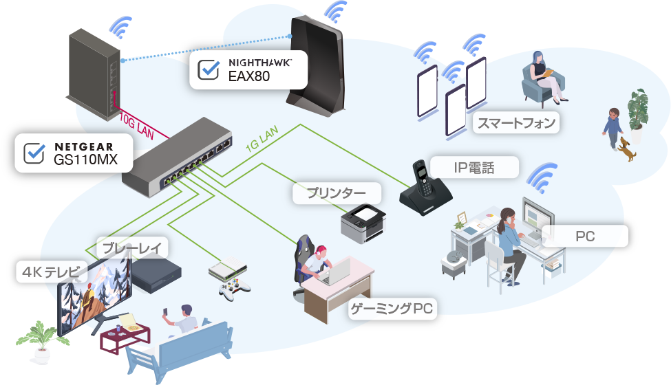 親が書斎で仕事をしている傍ら、子どもは部屋でゲームやストリーミング配信を楽しむ。いつの間にか各部屋同時に高速通信を行う場面が家庭にあふれています。ルーター付近だけでなく、全部屋で10G高速インターネット通信を利用するには、最新WiFi 6に対応したメッシュエクステンダーが最も簡単でお手頃な手段です。まずはここから、10Gホームネットワークの世界へ。