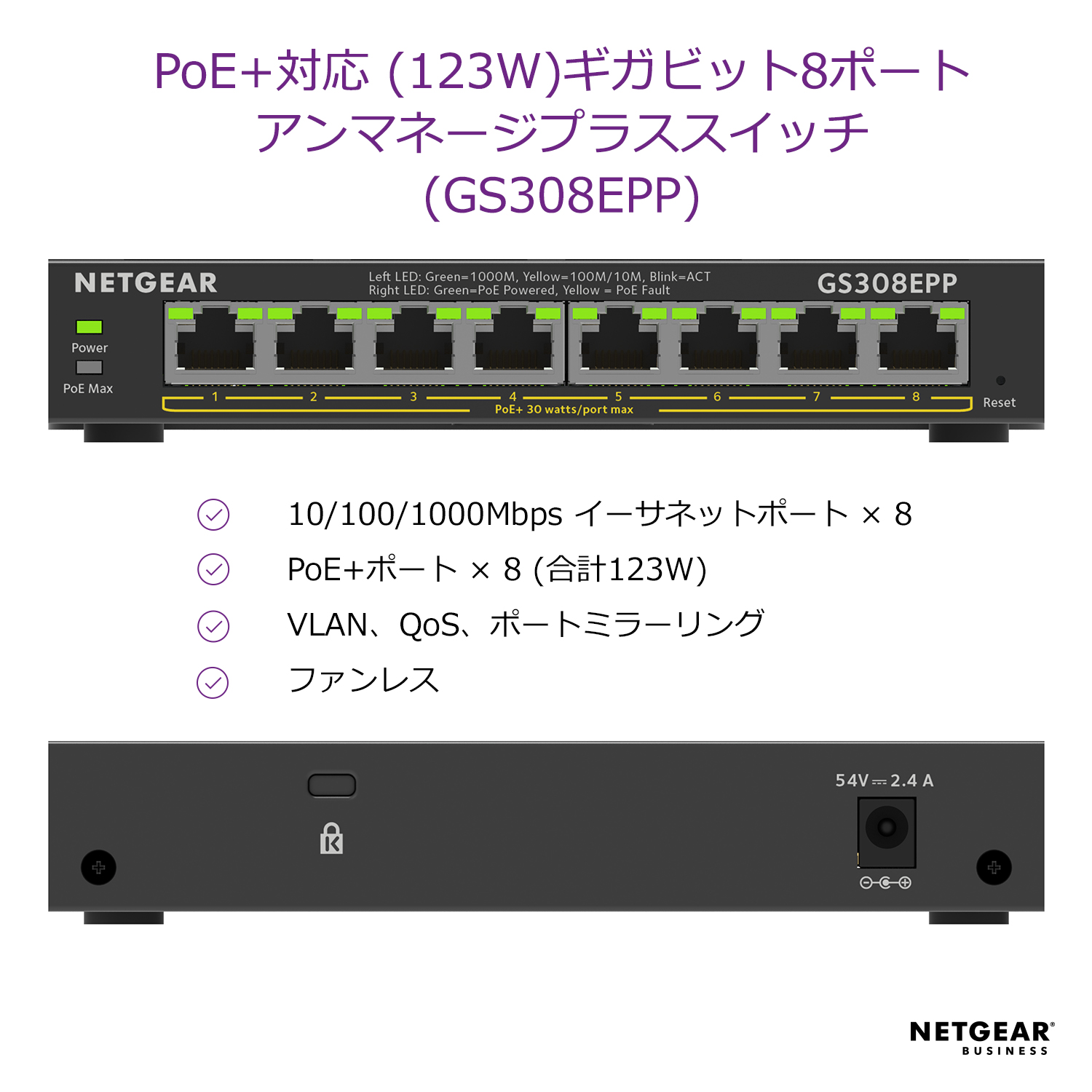 ギガビット8ポート アンマネージスイッチ【在庫以上のご注文の場合は、お問い合わせください】| GS308-300JPS| ¥4,142(税込) PoE対応 (53W) ギガビット8ポート アンマネージスイッチ| GS308P-100JPS| ¥10,000(税込) PoE+対応 (83W) ギガビット8ポート アンマネージスイッチ【在庫以上のご注文の場合は、お問い合わせください】| GS308PP-100AJS| ¥19,088(税込) ギガビット8ポート アンマネージプラススイッチ【在庫欠品中のため、発送日はご注文後にご連絡いたします】| GS308E-100JPS| ¥5,030(税込) POE+対応 (62W) ギガビット8ポート アンマネージプラススイッチ【在庫以上のご注文の場合は、お問い合わせください】| GS308EP-100JPS| ¥16,500(税込) POE+対応 (123W) ギガビット8ポート アンマネージプラススイッチ【在庫以上のご注文の場合は、お問い合わせください】| GS308EPP-100JPS| ¥20,382(税込) ギガビット8ポートスマートスイッチ| GS308T-100JPS| ¥13,200(税込)