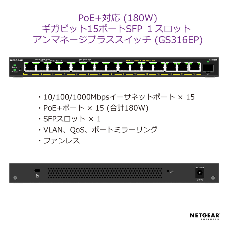 GS316| GS316-100JPS| ¥10,010(税込) POE+対応 (115W) ギガビット16ポート アンマネージスイッチ【在庫欠品中のため、発送日はご注文後にご連絡いたします】| GS316P-100AJS| ¥30,606(税込) POE+対応 (183W) ギガビット16ポート アンマネージスイッチ【在庫以上のご注文の場合は、お問い合わせください】| GS316PP-100AJS| ¥34,294(税込) PoE+対応 (180W)ギガビット15ポートSFP 1スロット アンマネージプラススイッチ【在庫以上のご注文の場合は、お問い合わせください】| GS316EP-100JPS| ¥36,430(税込) PoE+対応 (231W)ギガビット15ポートSFP 1スロット アンマネージプラススイッチ【在庫以上のご注文の場合は、お問い合わせください】| GS316EPP-100JPS| ¥43,870(税込)