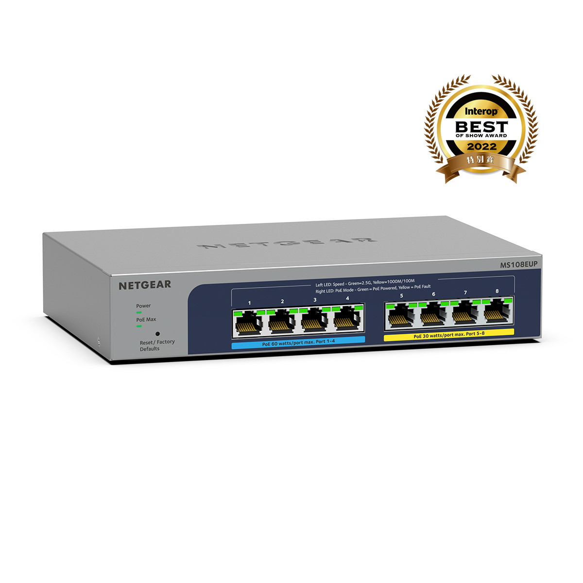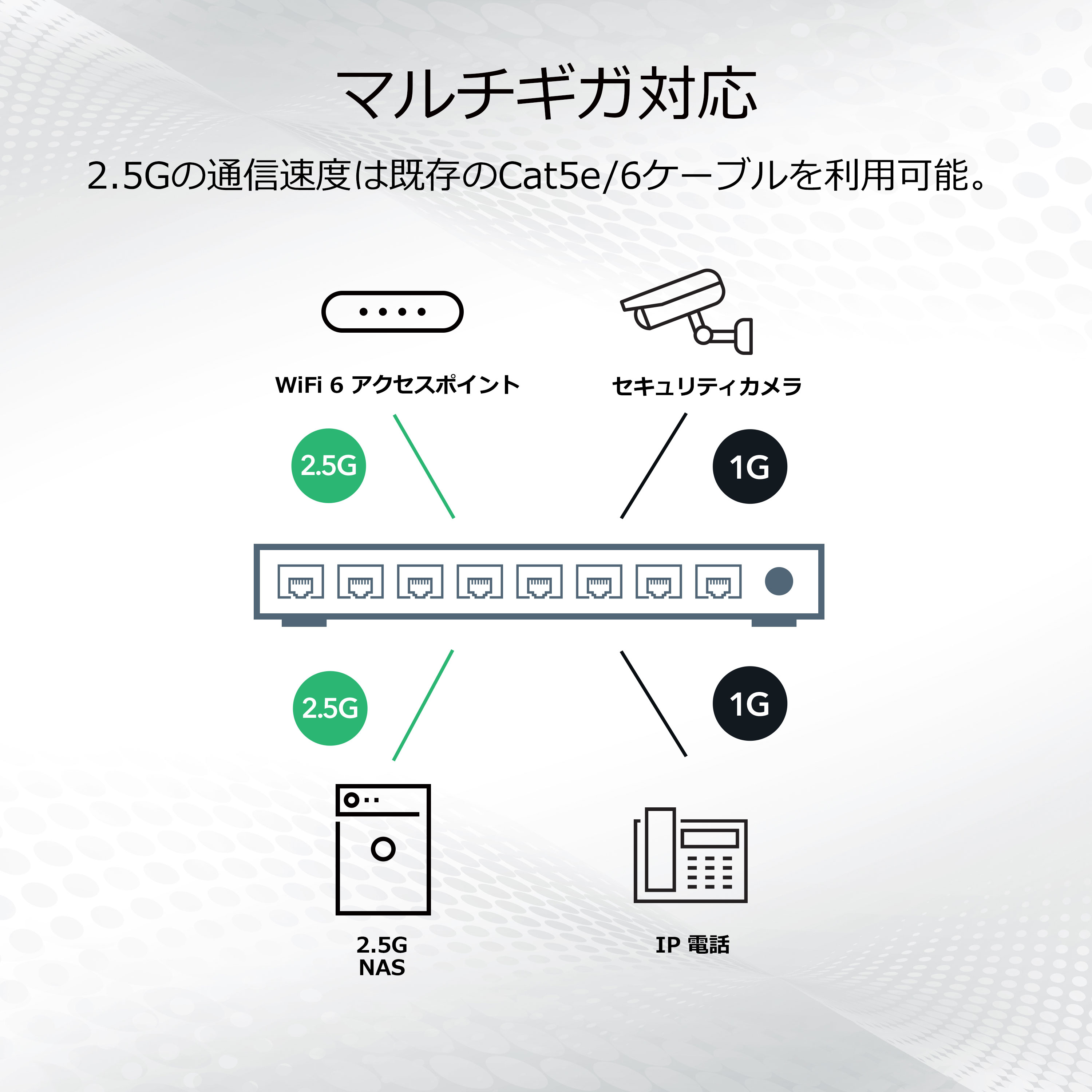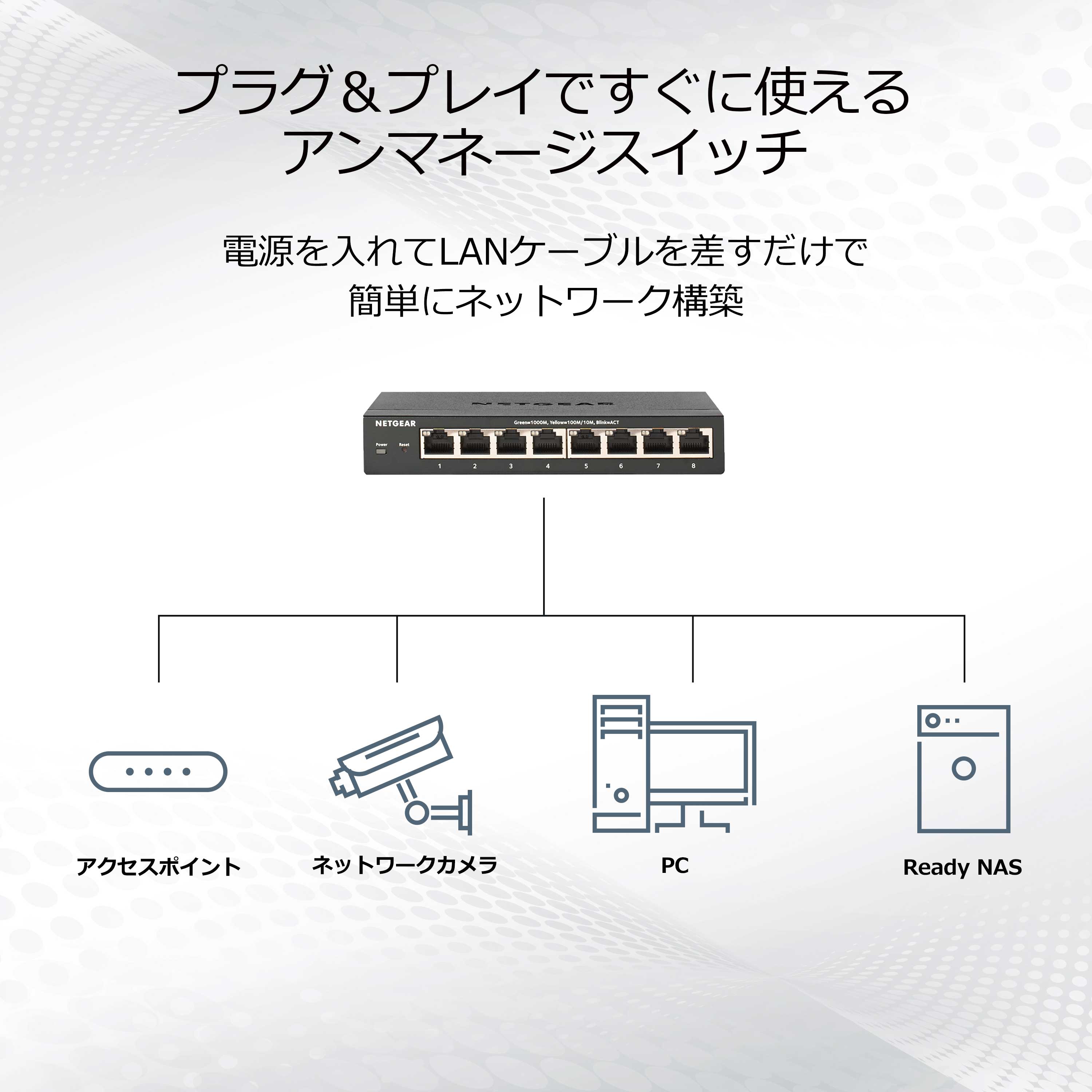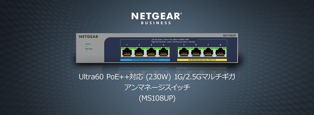 商品情報 【Ultra60 PoE++対応 (230W) 1G/2.5Gマルチギガ アンマネージスイッチ】 メーカーサイトを見る 1G/2.5Gマルチギガポートを8基搭載したアンマネージスイッチ。既存のCat5e/Cat6ケーブルを使用して2.5Gの高速スピードを実現。 IEEE 802.3bt Ultra60 PoE++×4(1ポートあたり60W)、IEEE802.3at PoE+×4(1ポートあたり30W)、スイッチ全体で230Wの電力を供給 2.5Gポート搭載のWiFi 6対応アクセスポイントや高画質IPカメラの接続に最適 ファンレス静音設計のため、会議室など動作音を気にする場所にも設置できる。 壁掛けキット付属 リミテッドライフタイムハードウェア保証 https://www.netgear.com/jp/supportinfo/about-warranty/ ************************************************* 保守詳細 クイックデリバリー翌営業日 【PRRND11P-100JPS】 全製品(一部製品を除く)用クイックデリバリー翌日1年 (提供範囲:日本全国) スイッチ オンサイトサポート 翌営業日、1年 【PMPND11P-100JPS】 プラス/クリック/スマート/L2マネージ用オンサイト翌日 1年 (提供範囲:日本全国) オンコールサポート 1年 【PMB0312P-100JPS】 (提供範囲:日本全国) ************************************************