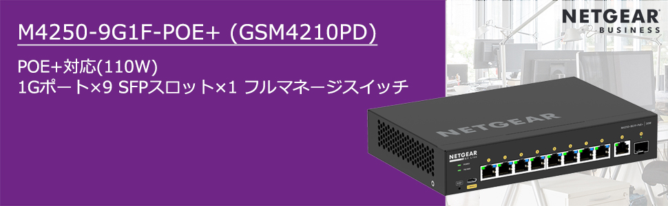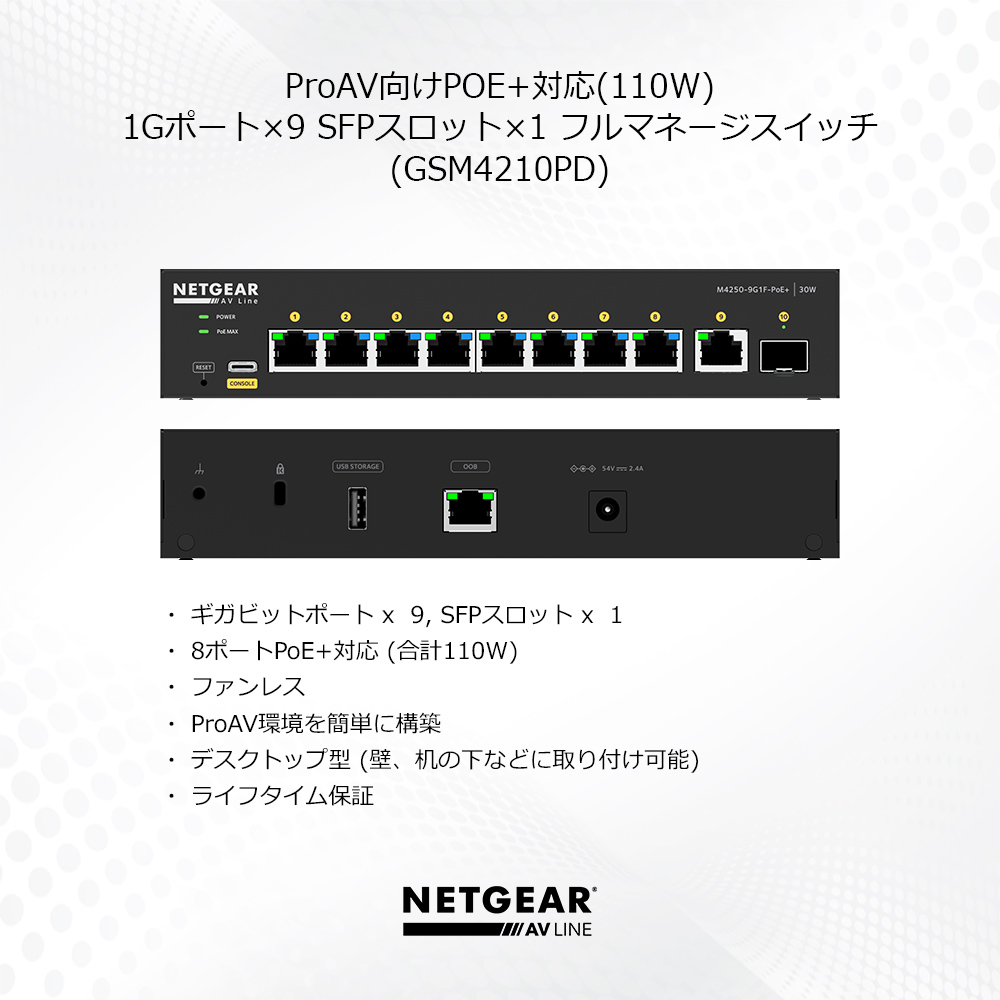 商品情報 【M4250-9G1F-PoE+ ギガ9ポート SFP 1スロット PoE+対応(110W) フルマネージスイッチ ProAV IGMP Plus GSM4210PD】 メーカーサイトを見る ProAVシステムに最適化されたスイッチで、必要なポート数のモデルを選んでエンドポイントデバイスを接続すれば、あとはスイッチの電源を入れるだけ簡単にProAV環境を構築できます。 ギガビットポートを9個とSFPスロットを1個搭載PoE+に対応しており、1ポートあたり30W、8ポート合計で110Wの電力を供給PIMルーティングなど設定が不要なプラグアンドプレイマルチキャスト用のためのIGMP+(IGMPプラス)をサポートファンレス静音設計デスクトップ型で手軽に設置可能【ライフタイムハードウェア保証】ネットギアのサポート窓口は365日年中無休で対応します。(購入後サポートの際には無償ユーザ登録が必要です)