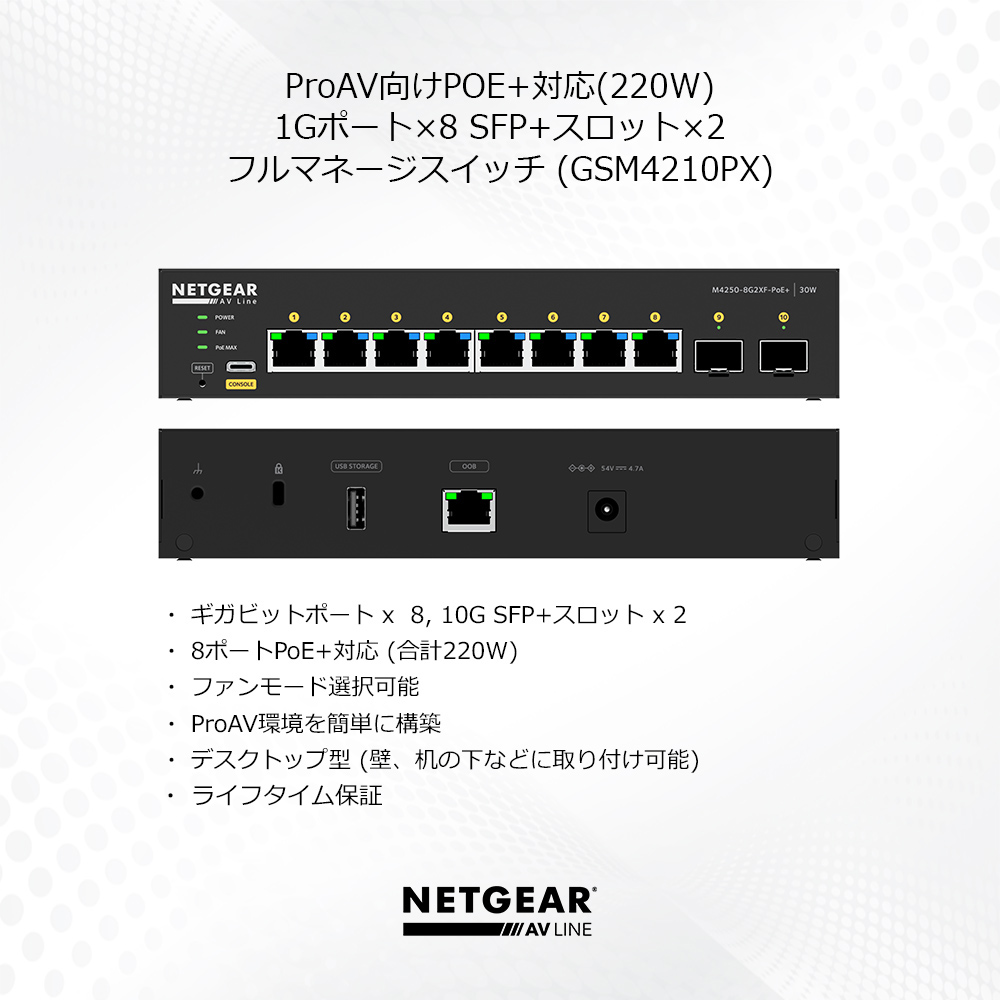 ProAV向けPoE+対応(220W) ギガビット 8ポート 10G SFP+ 2スロット フルマネージスイッチ【在庫以上のご注文の場合は、お問い合わせください】