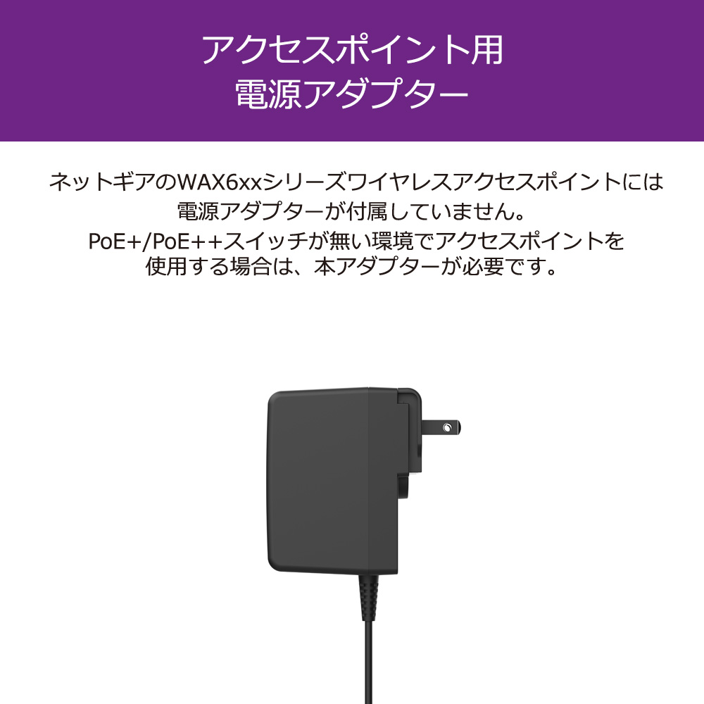 特長【アクセスポイント用電源アダプター (12V/3.5A)】 無線LANアクセスポイント用の電源アダプター。対応アクセスポイント: WAX630E, WAX630, WAX625, WAX620, WAX615, WAX610等 アクセスポイントには電源アダプターは同梱されていません。 アクセスポイントをPoE+/PoE++スイッチと組み合わせてLANケーブルで給電する場合は本アダプターは不要。 PoE+/PoE++スイッチが無い環境でアクセスポイントを使用する場合、本アダプターが必要。 電源アダプターの保証期間は購入から2年。