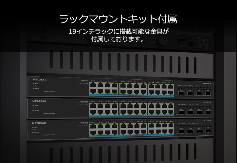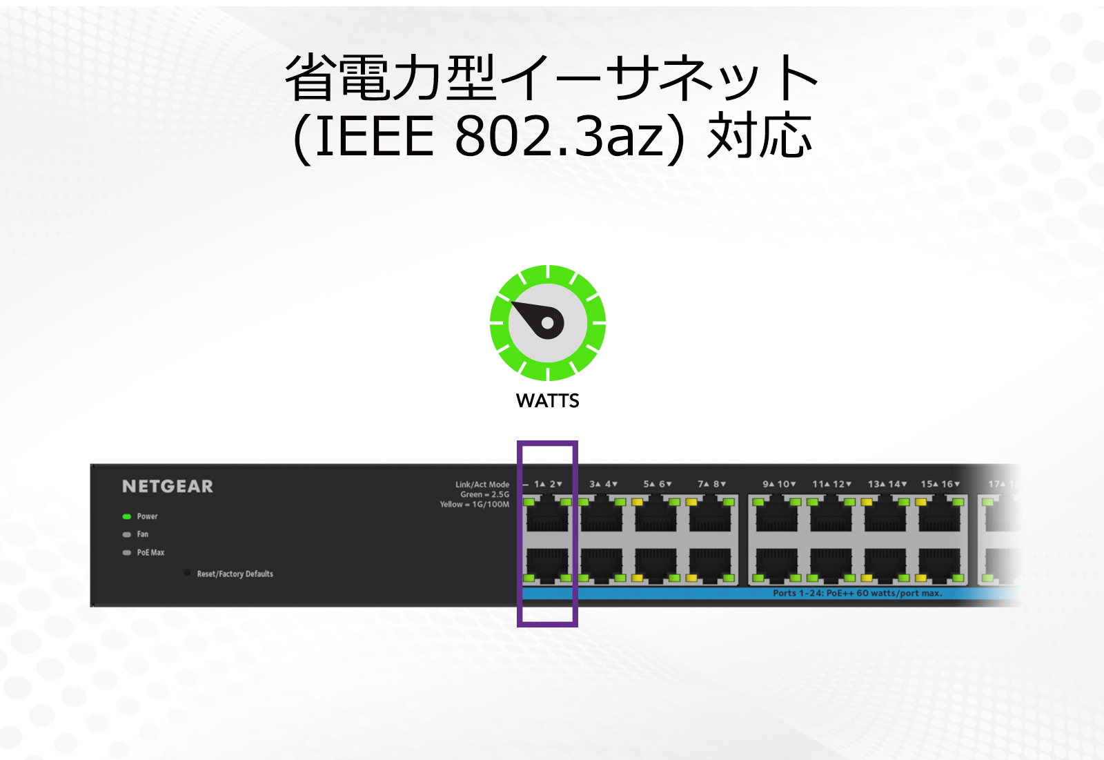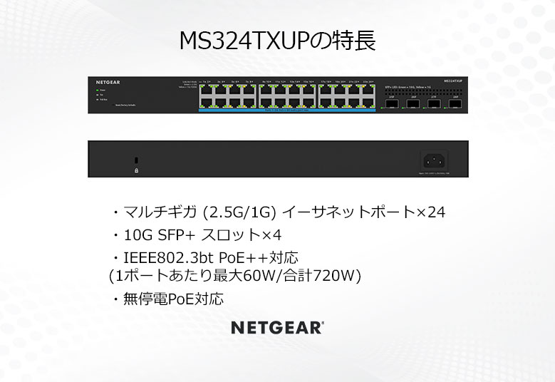 商品情報 Ultra60 PoE++対応 (720W) 2.5G/1G 24ポート SFP+スロット×4 アプリ&クラウドスマートスイッチ 2.5G/1Gマルチギガポートを24ポートと10G SFP+スロットを4基搭載したスマートスイッチ。 全24ポートがIEEE802.3bt PoE++に対応(1ポートあたり60W)しており、スイッチ全体で720Wの電力を無線LANアクセスポイントやIPカメラなどの受電機器に供給できる。 Insightアプリでどこからでも設定変更や監視が可能な、クラウド管理機能を搭載。また、スタンドアロンモードに設定することで通常のスマートスイッチとしても使える。 IPv6管理、ACL、DiffServ QoS、LACPリンクアグリゲーション、スパニングツリー、スタティックルーティングなどの高度な機能に対応。 5年保証 安心の日本語サポート ネットギアのサポート窓口は365日年中無休で対応します。