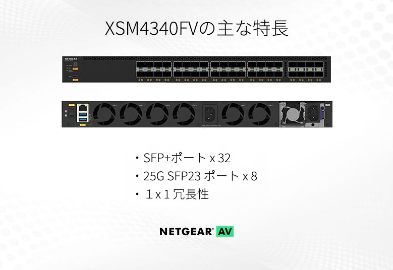 商品情報Pro AV対応 M4350-32F8V 32 x SFP+および8 x SFP28 25G L3スタッカブルフルマネージスイッチ メーカーサイトを見る 8 25GBASE-X SFP28アップリンクを備えた32 10GBASE-X SFP+ポート 420W内部電源装置 モジュラ電源用1スロット(1+1冗長性) APS350Wv1, APS600Wv3, APS1200Wv2, APS2000Wv2をサポート スタッキング機能により、ノンストップフォワーディング (NSF) とヒットレスフェイルオーバーを実現 静的ルーティング, ポリシーベースルーティング, ダイナミックルーティングなどのL3機能セット NETGEAR IGMP Plus™, AV専用設定画面, Engageコントローラにより、AVデバイスの導入が容易になります。 NETGEARのライフタイムハードウェア保証対応 お客様が対象製品をお持ちの間は、期間を定めずハードウェア故障に対する保証をご提供する無償製品保証。