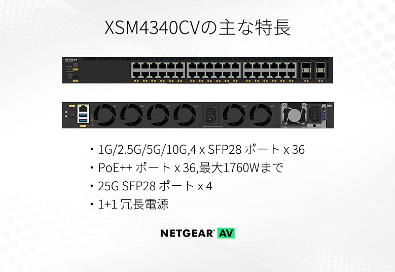 商品情報Pro AV対応 M4350-36X4V 36x10G/マルチギガPoE++(ベース280W,最大1,760 W)および 4xSFP28 25G L3スタッカブルフルマネージスイッチ メーカーサイトを見る 4 25GBASE-X SFP28アップリンクを備えた36 10G/マルチギガPoE++ポート 750W内蔵電源で280WのPoE容量をサポート 電源ユニット追加用の空きスロット×1 APS350Wv1, APS600Wv3, APS1200Wv2, APS2000Wv2をサポート 冗長PoE容量が280Wの状態で、最大1,760Wをサポート スタッキング機能により、ノンストップフォワーディング (NSF) とヒットレスフェイルオーバーを実現 静的ルーティング, ポリシーベースルーティング, ダイナミックルーティングなどのL3機能セット NETGEAR IGMP Plus™, AV専用設定画面, Engageコントローラにより、AVデバイスの導入が容易になります。 NETGEARのライフタイムハードウェア保証対応