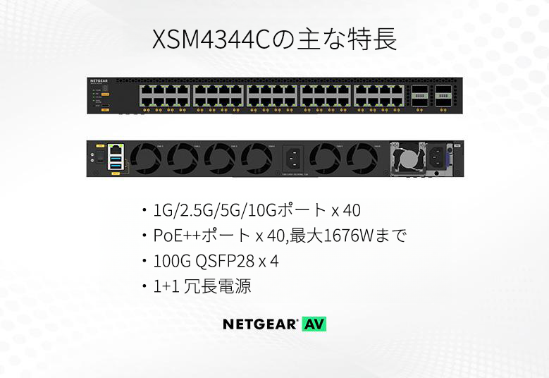 商品情報ProAV対応 40x10G/マルチギガPoE++(196Wベース,最大1,676 W)および4xQSFP28 100G L3スタッカブルフルマネージスイッチ メーカーサイトを見る 4 100GBASE-X QSFP28アップリンクを備えた40 10G/マルチギガPoE++ポート 750W内蔵電源で196WのPoE容量をサポート 電源ユニット追加用の空きスロット×1 APS350Wv1, APS600Wv3, APS1200Wv2, APS2000Wv2をサポート 冗長PoE容量が196Wの状態で、最大1,676Wをサポート スタッキング機能により、ノンストップフォワーディング (NSF) とヒットレスフェイルオーバーを実現 静的ルーティング, ポリシーベースルーティング, ダイナミックルーティングなどのL3機能セット NETGEAR IGMP Plus™, AV専用設定画面, Engageコントローラにより、AVデバイスの導入が容易になります。 NETGEARのライフタイムハードウェア保証対応