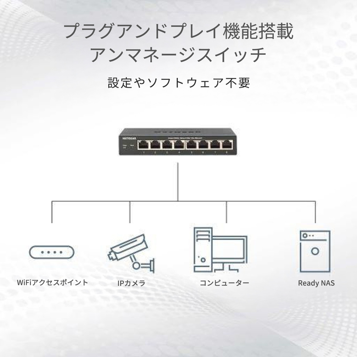 製品の特長 最高の組み合わせ ワイヤレスアクセスポイントとマルチギガ対応スイッチ組み合わせれば、パワーとスピードでネットワークを最適化することができます。 ワイヤレスアクセスポイントへ 高い信頼性とパフォーマンス ノンブロッキングの優れたネットワークパフォーマンスにより、妥協のない真のマルチギガ速度を実現 省電力設計 合計40Gbpsのスイッチング容量により、混雑のない接続を実現。 プラグ&プレイ インストール不要設定不要メンテナンス不要 サイレント設計 ファンレス設計により、どこにいてもノイズがゼロになるため、騒音に敏感な環境に最適です。 多様な取り付け方法 同梱のマウントキットで、デスクトップや壁面に設置できます。