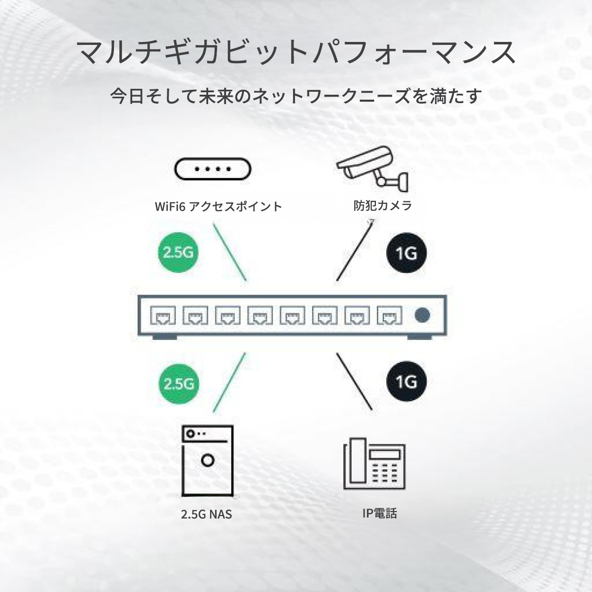 商品情報 【2.5Gマルチギガ 8ポート アンマネージスイッチ】 メーカーサイトを見る ・ネットワークをマルチギガスピードにアップグレードするための手頃なソリューションを提供します。 ・耐久性のある金属筐体で、付属のキットを使用して机上、壁掛け、テーブルの下などに設置できます。 ・ノンブロッキングの優れたネットワークパフォーマンスにより、妥協のない真のマルチギガ速度を実現 ・Energy Efficient Ethernet(IEEE 802.3az)規格により、アクティブポートのトラフィックが少ない場合や、リンクがない、または通信が検出されない場合に消費電力を削減することができます。 製品保証 ・製品保証: 3年間 ・サポート: 1年間の無償テクニカルサポートサービス (電話、メール、チャット) 付属 サポートサイトを見る