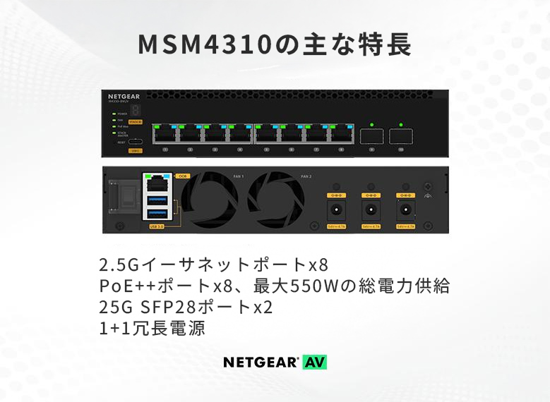 ProAV向けPoE++対応 2.5G (119W, 最大551W) x8ポート, 25G SFP28 x2スロット搭載フルマネージスイッチ【在庫以上のご注文の場合は、お問い合わせください】