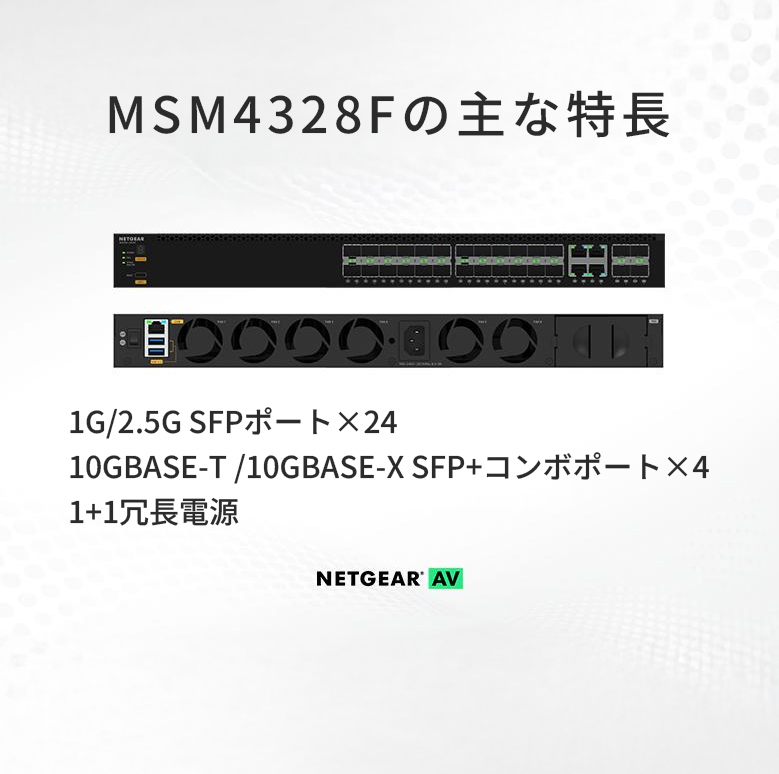 ProAV向けPoE++対応 2.5G (119W, 最大551W) x8ポート, 25G SFP28 x2スロット搭載フルマネージスイッチ【在庫以上のご注文の場合は、お問い合わせください】| MSM4310-100AJS| ¥615,353(税込) ProAV向け 24x1G/2.5G SFPおよび4x10Gコンボ/SFP+フルマネージスイッチ【在庫以上のご注文の場合は、お問い合わせください】| MSM4328F-100AJS| ¥839,882(税込) ProAV向けPoE++対応 24x2.5G、4x10G/マルチギガ、および4xSFP28 25G フルマネージスイッチ【在庫以上のご注文の場合は、お問い合わせください】| MSM4332-100AJS| ¥906,530(税込) ProAV向け40x10G SFP+および4x100G QSFP28 マネージスイッチ搭載フルマネージスイッチ【在庫以上のご注文の場合は、お問い合わせください】| XSM4344FC-100AJS| ¥1,617,647(税込) MSM4310およびGSM4210PX用254W Powerアダプター【在庫欠品中のため、発送日はご注文後にご連絡いたします】| APS254W-10000S| ¥64,706(税込)