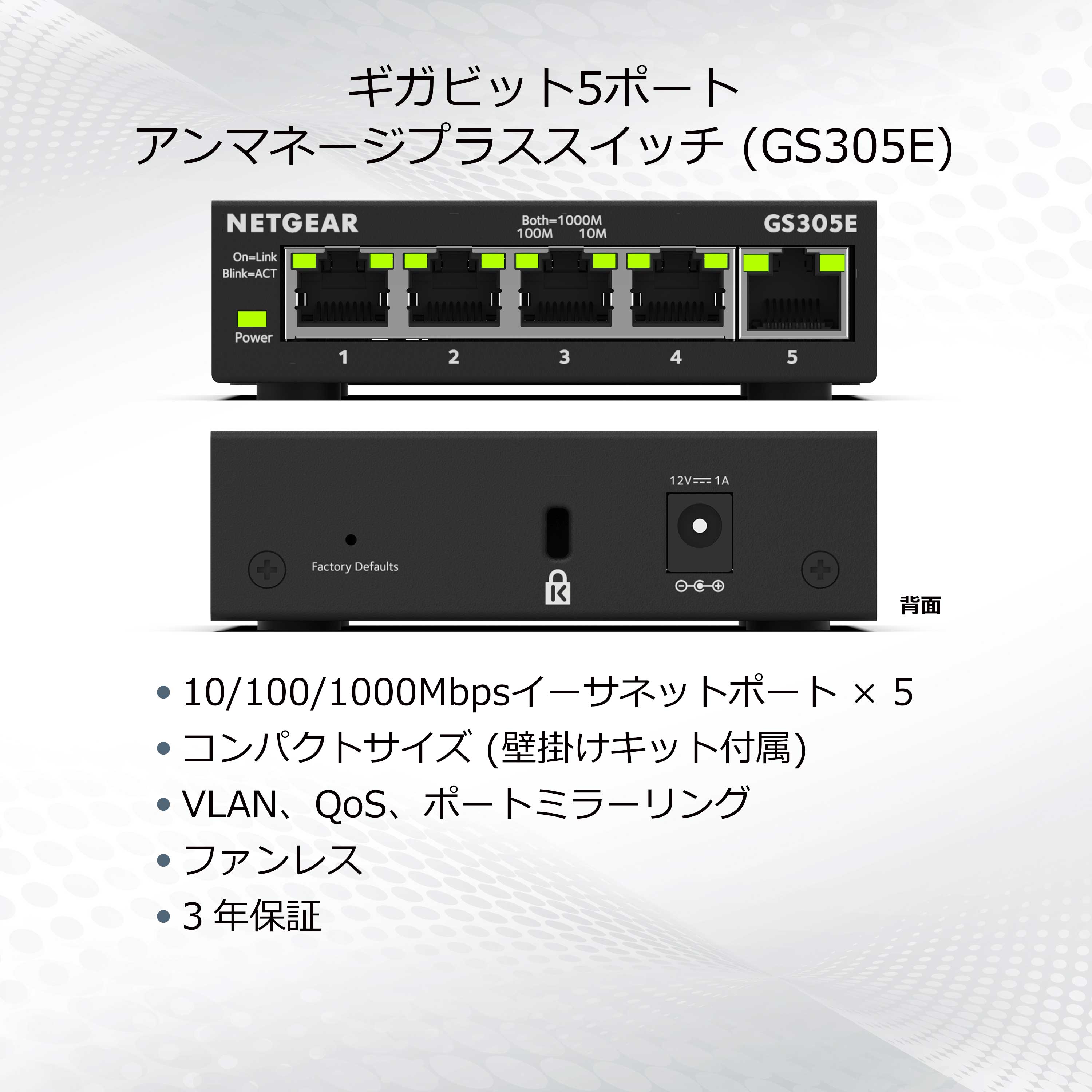商品情報 【ギガ5ポート アンマネージプラススイッチ】 メーカーサイトを見る ・ギガビット(10/100/1000Mbps)5ポート ビジネス向けのレイヤー2アンマネージプラス・スイッチ ・日本語GUI対応。ウェブブラウザーまたはWindows用の専用ツール(無償)で設定・管理運用が可能。 ・騒音源となる冷却ファンが不要で放熱性能の高い金属筐体。手のひらサイズのコンパクト設計。電源アダプターもコンパクト。 ・すべてのポートが同時にギガビット送受信してもパフォーマンスが劣化しないノンブロッキング設計。 ・VLAN(ポート、タグ)、QoS(802.1p, DSCP, ポート)、マルチキャスト(IGMPスヌーピングv1/2/3)。 ・5年保証 ・ご購入から30日以内にユーザー登録をするだけで、5年間のハードウェア保証が受けられます。 困った時のご相談や故障時の受付体制も日本語サポートで安心。10:00 - 19:00 月~金(祝日も営業)
